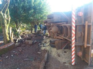 Uma acidente por pouco não virou uma grande tragédia na cidade de Constantina na manhã desta terça-feira 13. Um caminhão com placas do município fazia o trajeto no sentido Bairro São Roque quando em sua frente seguia um trator e uma plantadeira e o mesmo tentou uma ultrapassagem contra mão, ao ver que o maquinário iria dobrar a esquerda para acessar uma entrada lateral, o motorista percebendo que poderia ter a frente cortada freou para parar rápido, quando a cabine do caminhão se desprendeu e abriu, e o motorista ficou sem controle quando pulou do veículo em movimento e teve ferimento em uma das pernas. O caminhão Mercedez Bens seguiu até atingir um muro e capotar, o mesmo estava carregado de soja. Apenas o motorista estava no caminhão.