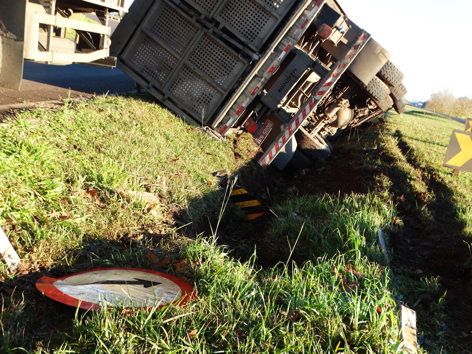Na manhã desta quinta-feira, 22 de junho, um caminhão carregado de suínos tombou na ERS 324 no trevo que dá acesso ao município de Ronda Alta.