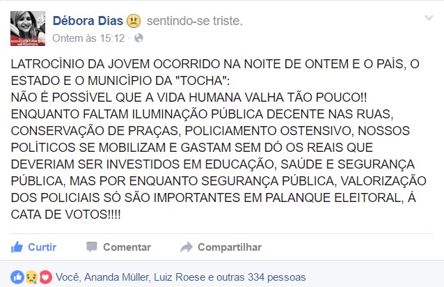 Veja o desabafo da Delegada, publicado na tarde de sábado:Uma das mais conceituadas Delegadas de Polícia do Estado, Débora Dias, que atua em Santa Maria, utilizou o Facebook para expressar o seu sentimento após o assalto que resultou na morte da jovem Shelli Vidoto, de 27 anos, de Santiago. O crime aconteceu na noite de sexta-feira, 8, no bairro Nossa Senhora das Dores.